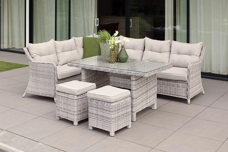Deze royale lounge-diningset heeft een mooi tijdloos design van lichtgrijs wicker in combinatie met lichte bijpassende kussens.