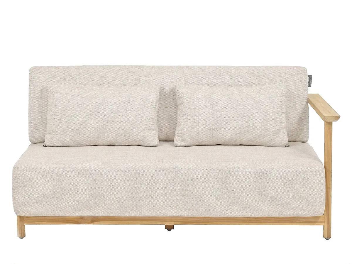 Deze doordachte combinatie zorgt ervoor dat de loungebank moeiteloos integreert in verschillende tuinstijlen, van modern tot klassiek.nnOptimaal comfort door slimme vormgevingDoor de asymmetrische vormgeving met linkse armleuning ontstaan veelzijdige plaatsingsmogelijkheden in jouw tuin. Het natuurlijke teakhout met matte afwerking straalt warmte uit, terwijl de lichtgrijze bekleding met fijne geweven textuur een neutrale elegantie toevoegt. Met afmetingen van 158 x 82 x 61 cm past deze loungebank perfect in moderne tuininrichtingen en creëert een ontspannen sfeer voor gezellige momenten buiten.nnTijdloze uitstraling voor jouw buitenruimteHet minimalistische ontwerp kenmerkt zich door strakke lijnen en een harmonieus kleurenpalet. Deze prachtige tuinbank combineert hoogwaardig teakhout met comfortabele Bee Wett kussens in een lichtgrijze uitvoering.