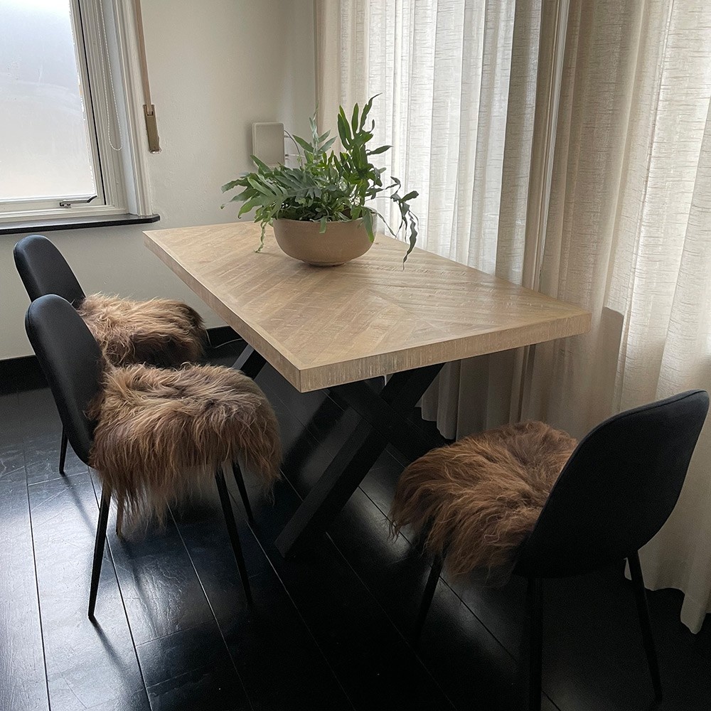 Koeienhuid decoraties/Schapenvacht stoelkussens.
