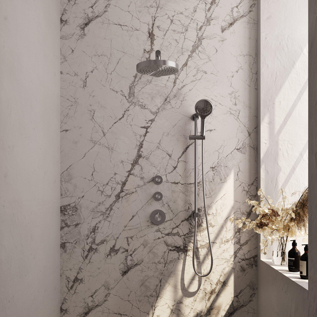 BRAUER Stripe Thermostatische Inbouw Regendouche - SET 10 - 25cm douchekop - rechte muurarm - 3-standen handdouche - doucheslang - geïntegreerde glijstang - RVS-kleurig geborsteld PVD 5-NG-383 kopen? Sanitairwinkel.nl is dé Brauer specialist met een groot assortiment Douchekranen.