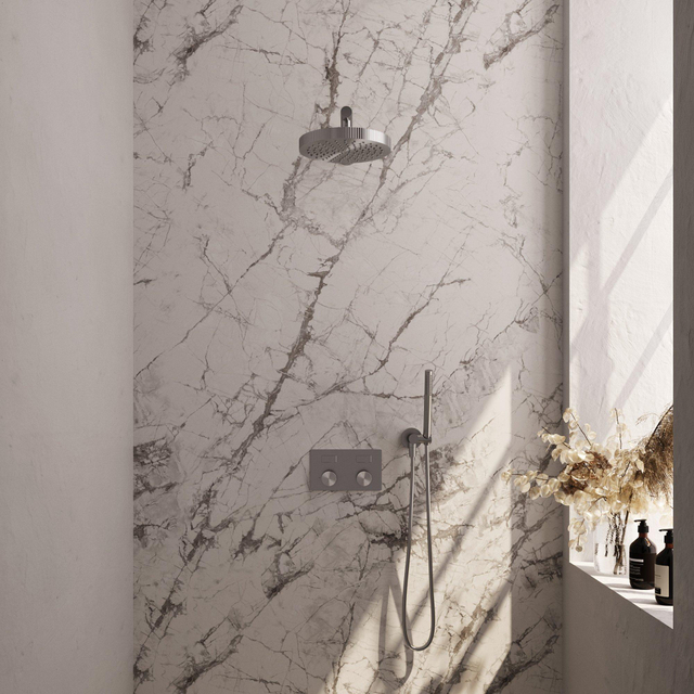 BRAUER Stripe Thermostatische Inbouw Regendouche - drukknoppen - 25cm douchekop - rechte muurarm - staaf handdouche - doucheslang - wandaansluitbocht - RVS-kleurig geborsteld PVD 5-NG-413 kopen? Sanitairwinkel.nl is dé Brauer specialist met een groot assortiment Douchekranen.