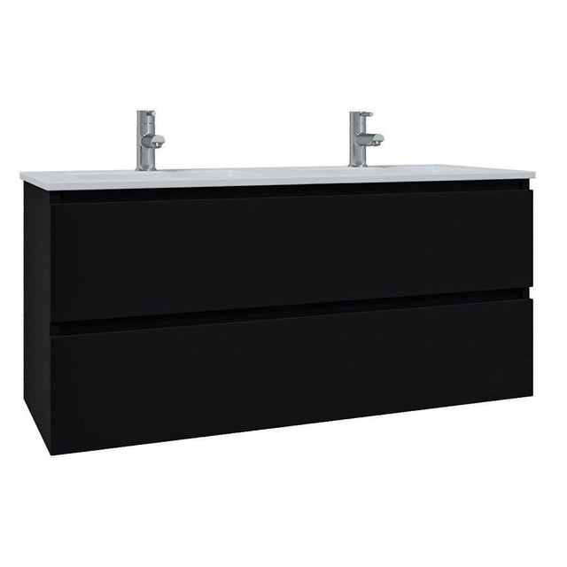 Saniclass Chaci Badkamermeubelset - 120x46x55cm - keramische wastafel wit - 2 wasbakken - 2 kraangaten - 2 lades - mat zwart SW1212777/SW804533 kopen? Sanitairwinkel.nl is dé Saniclass specialist met een groot assortiment Badkamermeubelsets.