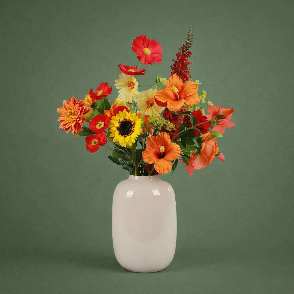 De perfecte combinatie van vrolijke bloemen straalt energie, vreugde en zomerse charme uit – een echte eyecatcher die nooit verwelkt. Haal de zon in huis met Sunny Delight, een sprankelend zijden boeket vol warme roze-, oranje- en roodtinten.