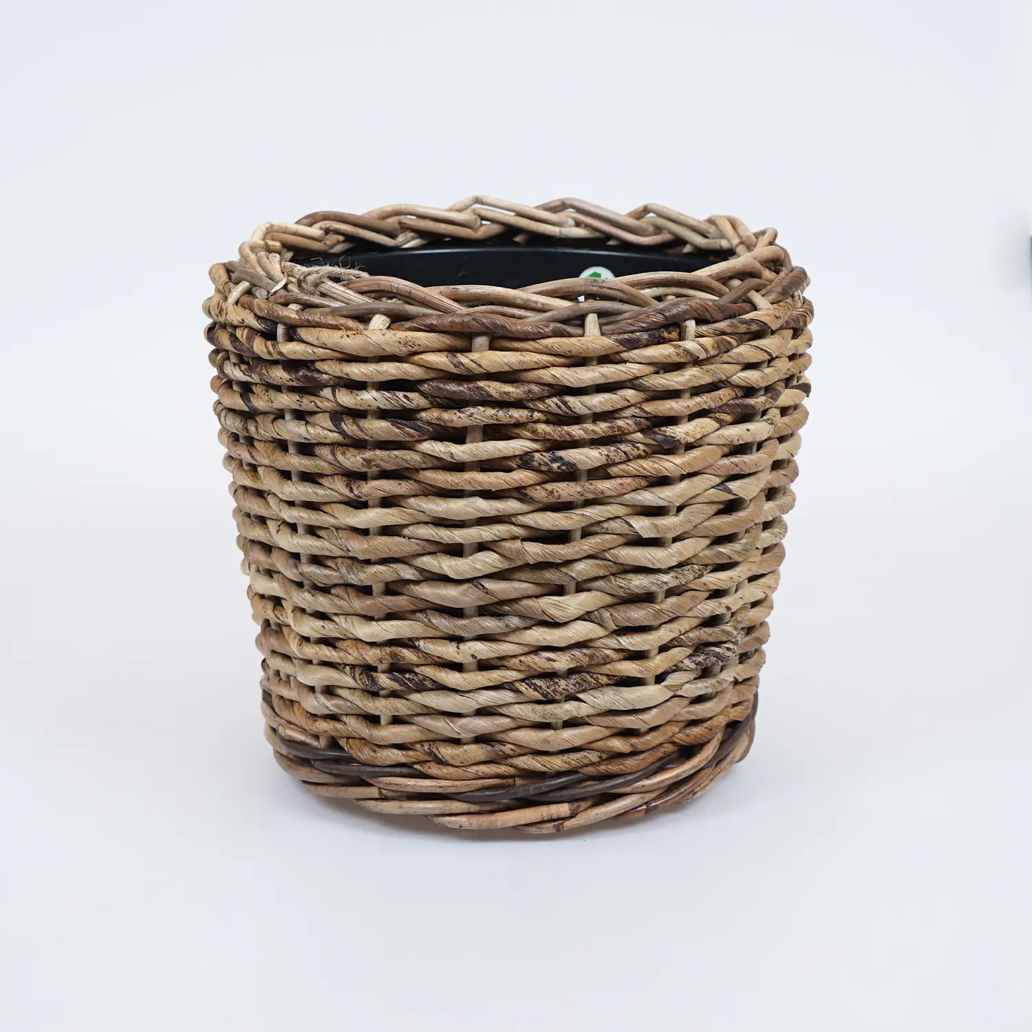 De Drypot is een gerecyclede kunststoffen pot, geplaatst in een handgemaakte rieten mand.