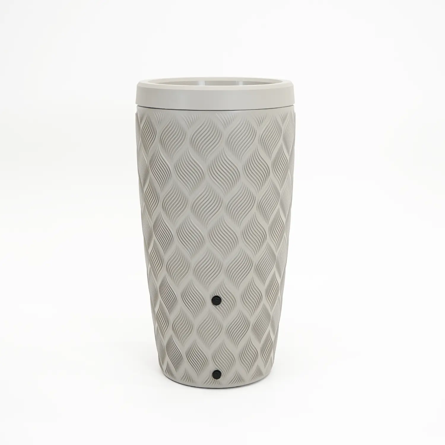 Met een inhoud van ongeveer 240 liter heb je ruim voldoende regenwater bij de hand voor het verzorgen van planten of het schoonmaken van de tuin tijdens drogere dagen. De lichte grijze kleur geeft een frisse en neutrale uitstraling die mooi combineert met groene beplanting, licht terraswerk of een moderne schutting.