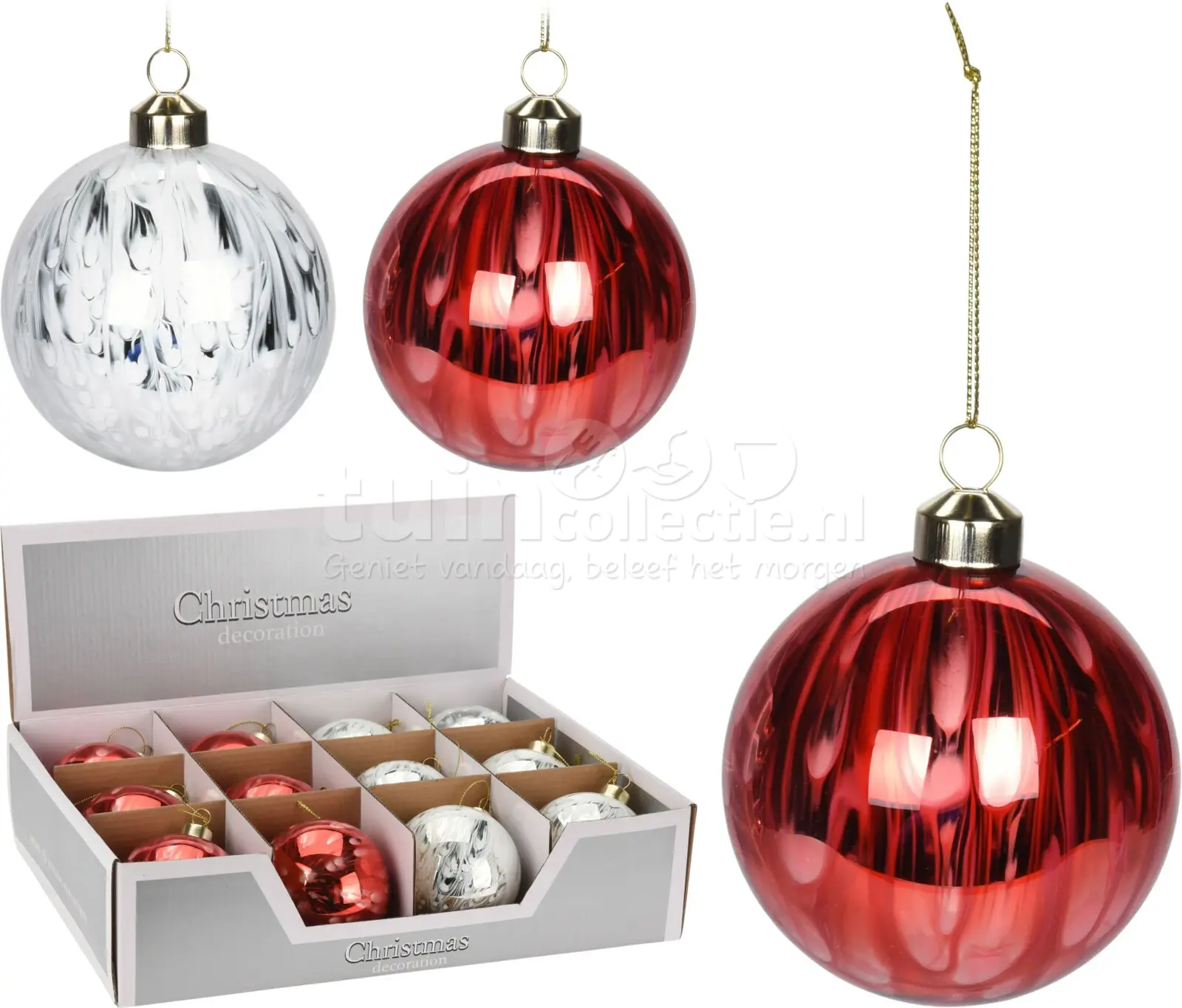 *Let op: Dit artikel is verkrijgbaar in 2 kleuren; rood en wit. Mocht je een voorkeur hebben voor kleur, geef dit dan bij Opmerking door in het bestelproces. Kerstbal Streep Glas Ø8cm Assorti 1st
