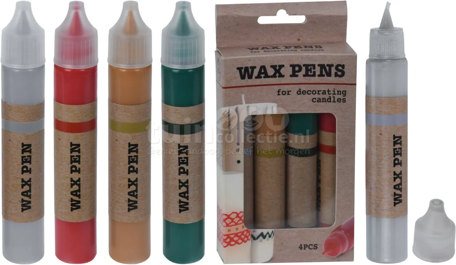 Met deze set waxstiften maak je de mooiste decoratie op je kaarsen. De verpakking bevat 4 stiften in de kleuren rood, groen, goud en zilver. Hiermee maak je ook tijdens de feestdagen in december een sfeervolle tekening of bijpassende tekst op je (stomp)kaarsen van wax.