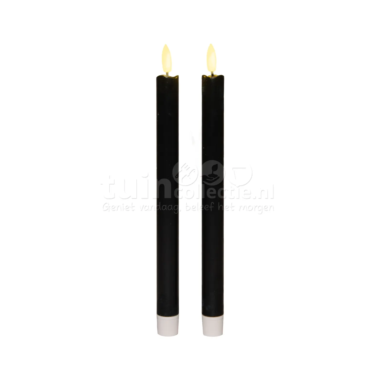 Deze set bestaat uit 2 kunststof kaarsen en zijn voorzien van een 3D vlameffect. LED Dinerkaars 26cm Zwart 2st