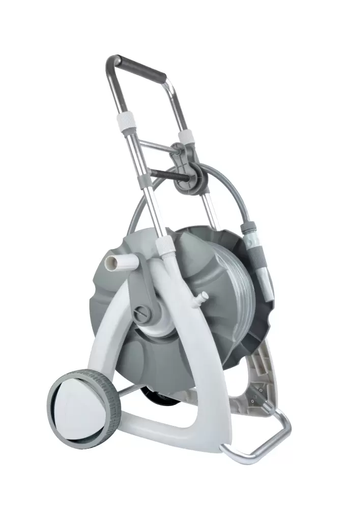 Deze slangenwagen is licht- en donkergrijs van kleur en is gemaakt van kunststof en metaal. Daarnaast is deze set voorzien van een druppelstop, waarbij de tuinslang na gebruik niet lekt. Verder voorkomt de meedraaiende aansluitas verdraaien van de slang bij het op- en afrollen en zorgt de slangeleider voor het netjes oprollen van de slang. Door de, in hoogte, verstelbare handgreep is de wagen eenvoudig te verplaatsen en kan ruimte bespaard worden bij het opbergen.