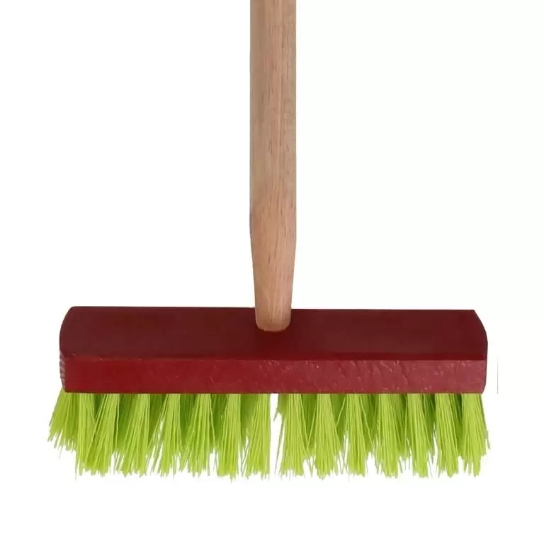De bezem die rood en groen van kleur is, is 20cm breed en de houten steel heeft een lengte van 80cm.