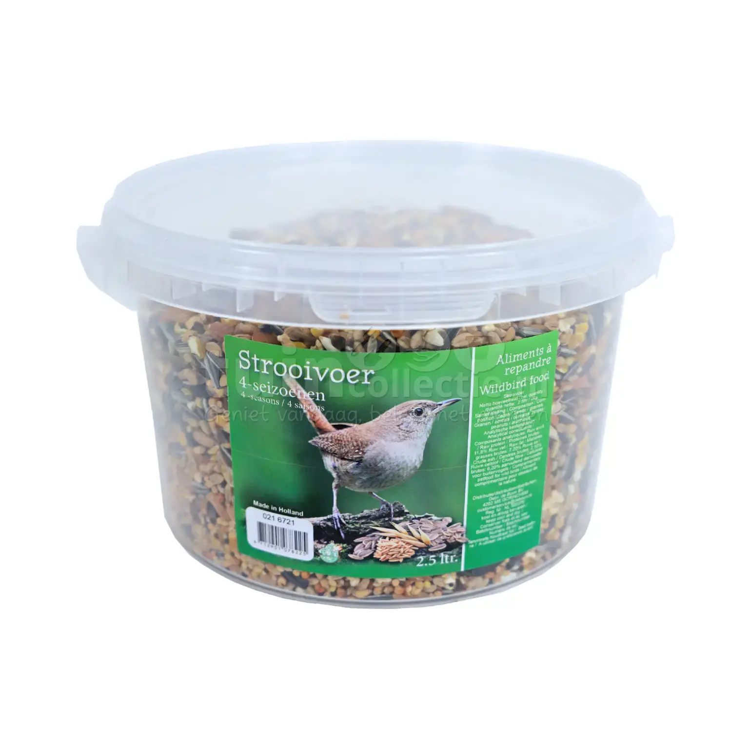 De emmer met een inhoud van 2,5 liter bevat zaden, pinda's en noten. Vogel Strooivoer 4-seizoenen 2,5L