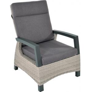 Prato Mountain verstelbare lounge tuinstoel Specificaties Afmetingen: 72 x 80 x 104 cm Materiaal frame: Aluminium Materiaal afwerking: Wicker 8x2mm / 7x2.2mm / 14x2.3mm Kleur wicker: Beige Kleur kussens: Grijs Rugleuning traploos verstelbaar dmv gasv....