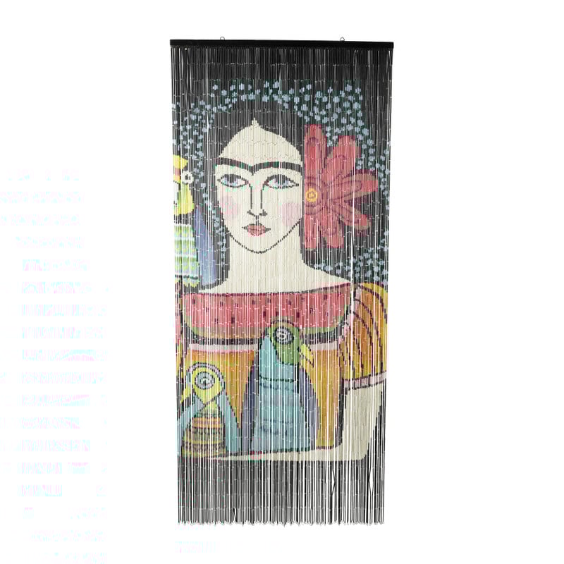 Op dit deurgordijn staat Frida met een vogel afgebeeld. Een deurgordijn staat prachtig en is daarnaast ook nog eens handig wanneer je de deur op warme dagen open wil laten staan.