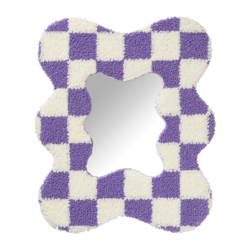 Materiaal De spiegel is gemaakt van teddy stof en glas. Daarnaast heeft de spiegel een geblokt patroon met de kleuren wit en lila, wat perfect past in een kleurrijk of juist neutraal interieur. De spiegel heeft een lijst van bouclé stof, een materiaalsoort dat helemaal on-trend is. Deze spiegel is helemaal in! Hang deze funky spiegel op in je woonkamer, slaapkamer of in de hal.