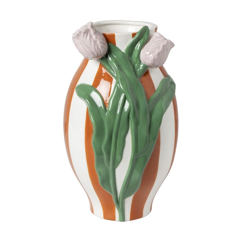 De vaas is gestreept in het wit en oranje en is aan de voorkant versierd met twee lichtroze tulpen. Plaats hem op een dressoir, bijzettafel of eetkamertafel voor een sfeervol accent.