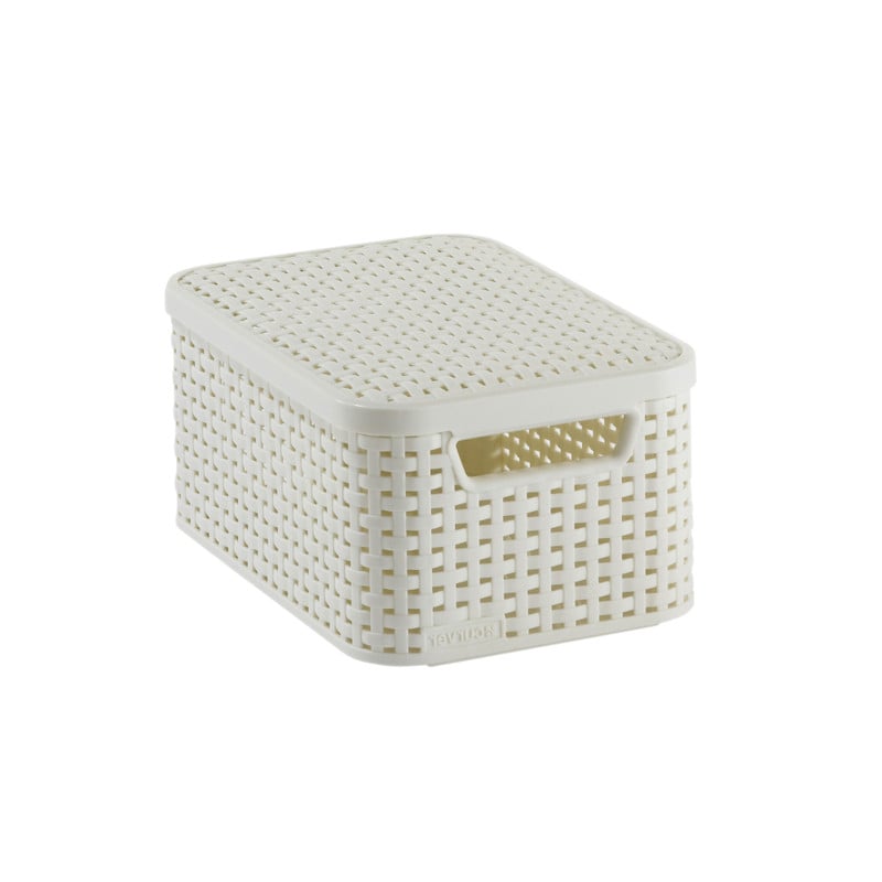De opbergmanden hebben een handvat aan beide kanten en een deksel. Ze hebben de uitstraling van riet maar de voordelen van kunststof: eenvoudig te reinigen en gemakkelijk in gebruik. De opbergboxen zijn voorzien van een vlechtstructuur die lijkt op natuurlijke materialen. De open structuur zorgt voor ventilatie, terwijl het moderne design in elk interieur past.