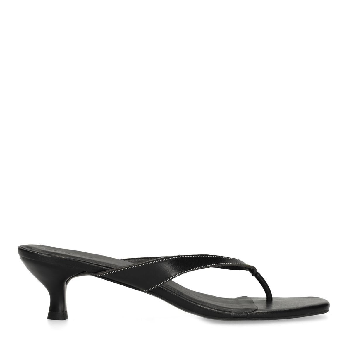 De muiltjes hebben witte gestikte details en een kitten heel van 5 cm. Zwarte leren teenslippers met hak van Sacha.
