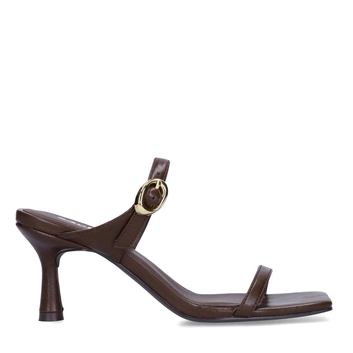 De chocolate brown sandalen hebben een trechterhak van 7 cm en een goudkleurige gespsluiting. Bruine muiltjes met hak van Sacha.