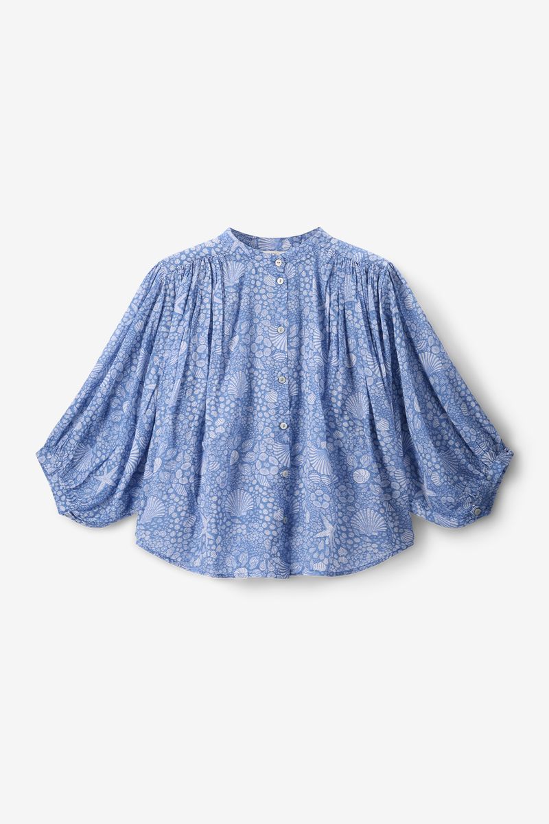 Het model heeft een lengte van 1,74 m en draagt maat S. Verder heeft de blouse wijde ballonmouwen en pintuck details bij de schouders en aan de achterzijde. De blauwe blouse is voorzien van een witte all-over print met zeesterren en schelpen. De blouse heeft driekwartmouwen, een hoge halslijn, een knoopsluiting en een wijde fit.