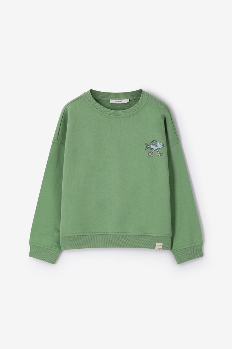 Verder heeft de sweater een groene kleur met grafisch vissen artwork op de voor- en achterzijde. De sweater heeft lange mouwen, een ronde halslijn, ribboorden, verlaagde schouders en een relaxed fit.