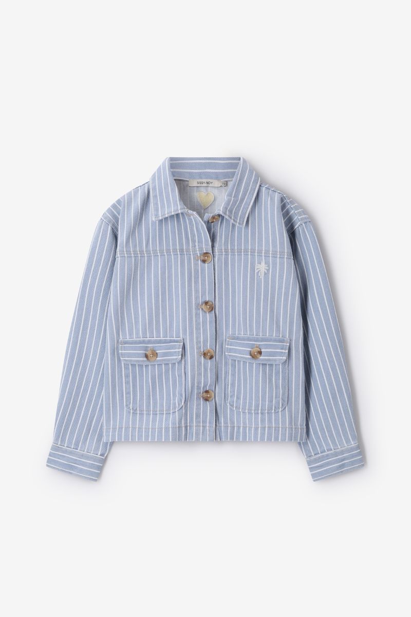 Verder heeft het jack een blauwe kleur met een all-over witte strepen design. Het jack heeft lange mouwen, een kraag, een knoopsluiting en twee opgestikte zakken aan de voorzijde.