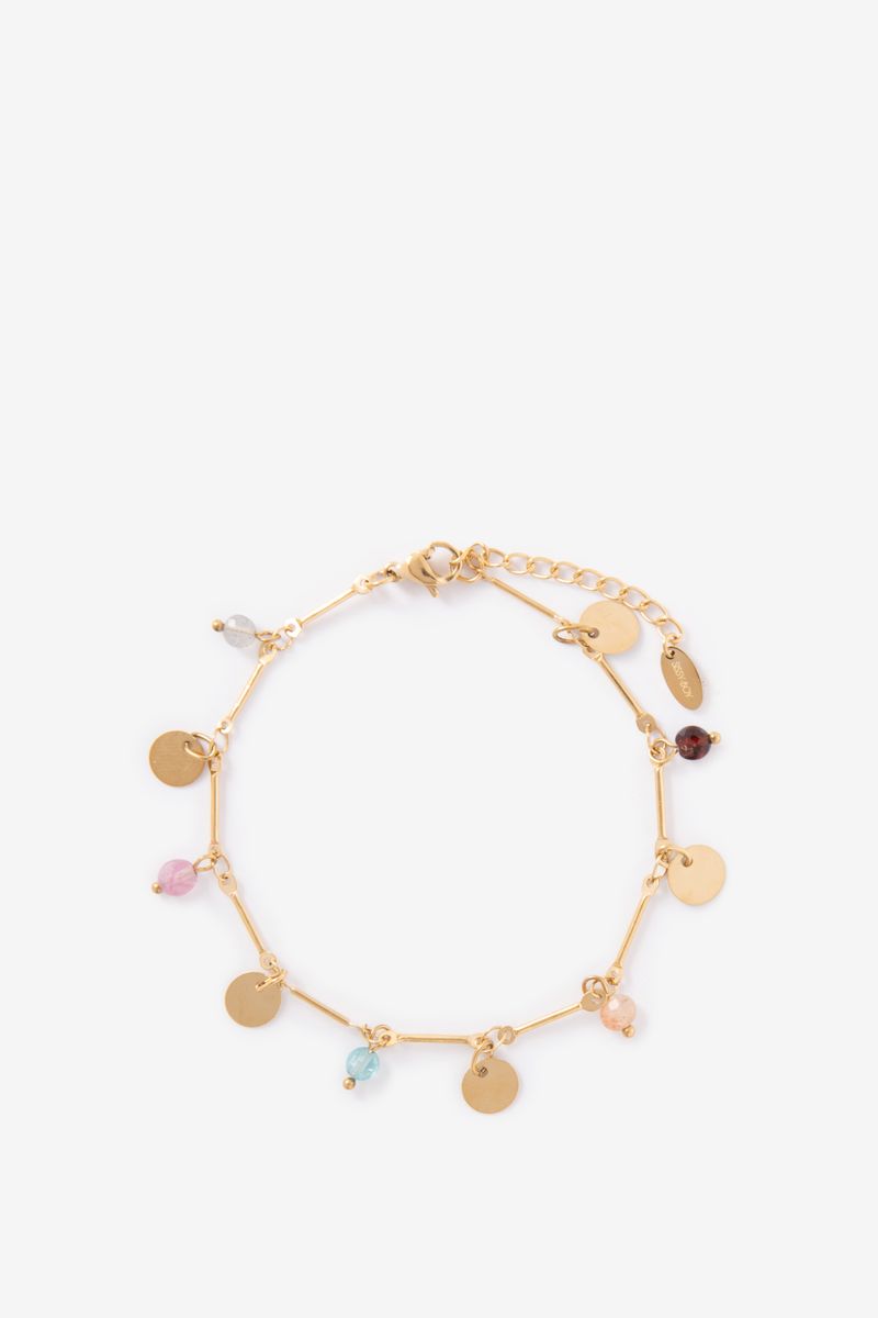 Verder hangen er ook kleine gekleurde steentjes en bolletjes aan. De armband heeft een gouden kleur en er hangen kleine muntjes aan. Gold plated armband met muntjes van Sissy-Boy.