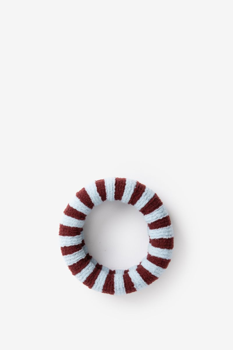 Het haarelastiekje heeft een lichtblauwe kleur met all-over donkerrode strepen. Lichtblauwe haarelastiek met strepen van Sissy-Boy.