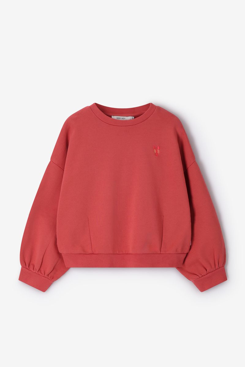 Verder heeft de sweater een donkerroze kleur met een subtiel kreeft borduursel detail aan de voorzijde. De sweater heeft lange pofmouwen, een ronde halslijn, ribboorden, verlaagde schouders en een relaxed fit.