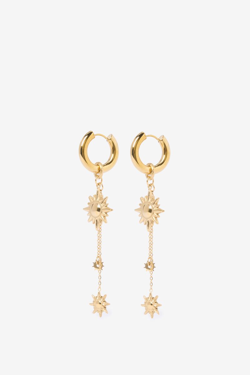 De oorbellen hebben een ringetje met daaronder drie zonnetjes in verschillende groottes. Gouden oorbellen met zonnetjes van Sissy-Boy.