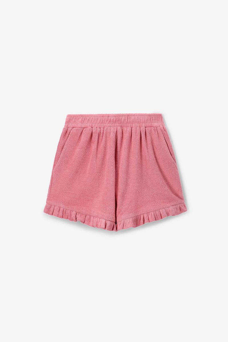 Verder heeft de short ruffle-details aan de onderkant van de broekspijpen. De short heeft twee steekzakken aan de voorzijde en een elastische tailleband.
