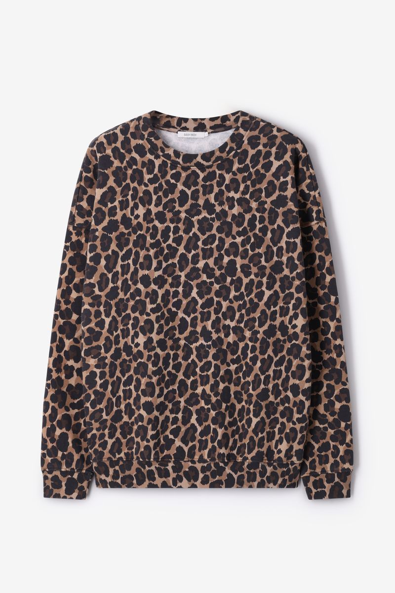 Verder heeft de sweater een all-over leopard print. De sweater heeft lange mouwen, een ronde hals en een oversized fit.