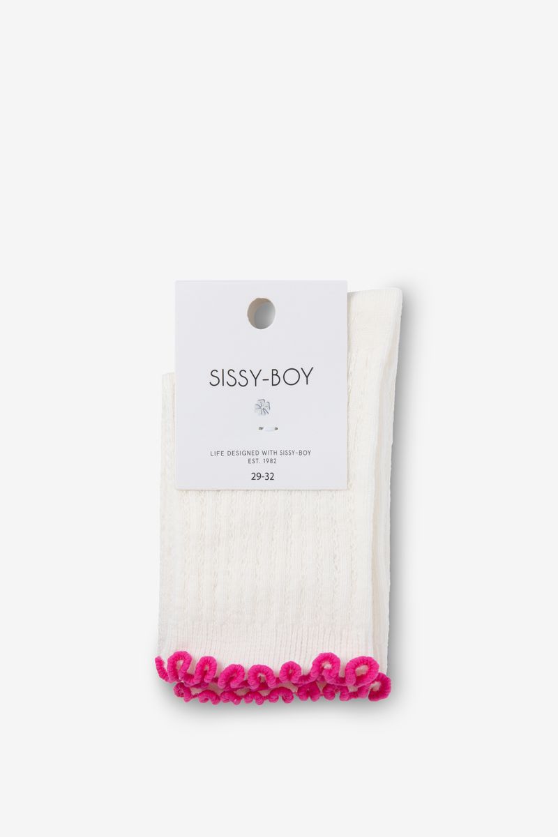 De sokken hebben een gebroken witte kleur, een ribstofkwaliteit en een donkerroze ruffle rand aan de bovenzijde. Gebroken witte sokken met ruffles van Sissy-Boy.