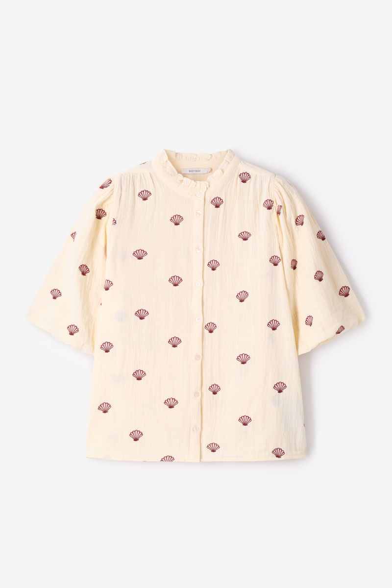Verder heeft de blouse een lichtgele kleur met een schelpen embroidery design. De blouse heeft korte mouwen, een ronde hals, een knoopsluiting en ruffle details.