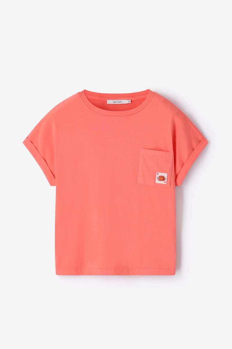 Het T-shirt heeft korte mouwen, een ronde halslijn, een borstzakje met badge, een omslag detail bij de mouwen en een boxy fit. Roze T-shirt van Sissy-Boy.