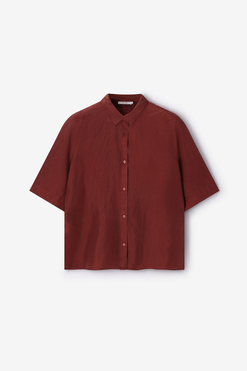 Verder heeft het een bruine kleur en plooien op de achterzijde. De blouse heeft korte mouwen, een reverse kraag, knoopsluiting en een boxy fit.