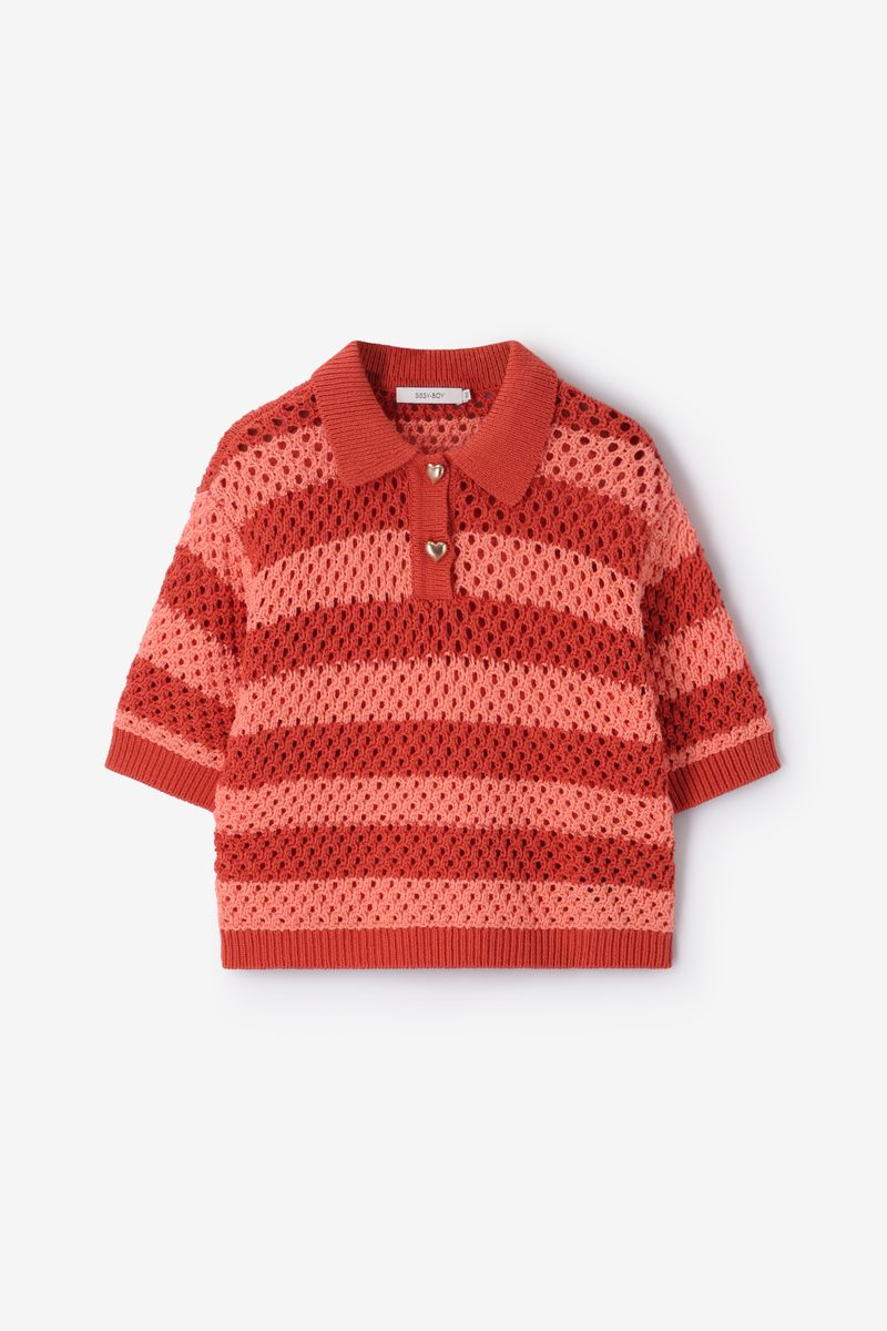 Verder heeft de polo een roze kleur met een strepen design. De open gebreide polo heeft korte mouwen, een polokraag en een hartjes knoopsluiting aan de voorzijde.