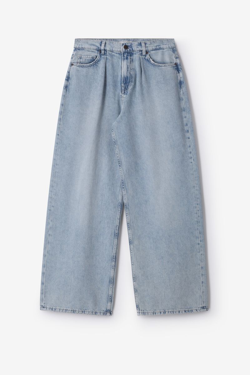 Verder heeft de broek een blauwe kleur, geplooide details aan de voorzijde en een denim kwaliteit. De broek heeft wijd uitlopende broekspijpen, een hoge taille, een 5-pocket model, loose fit en een knoop- en ritssluiting.