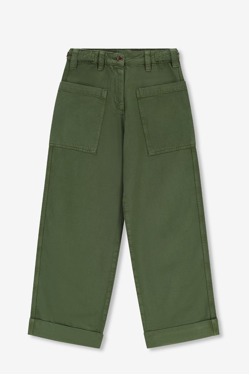 De omgeslagen broekspijpen en de knopen bij de taille geven de workwear model extra detail. De broek heeft daarnaast een 4-pocket model met opgestikte zakken aan de voor- en achterzijde.