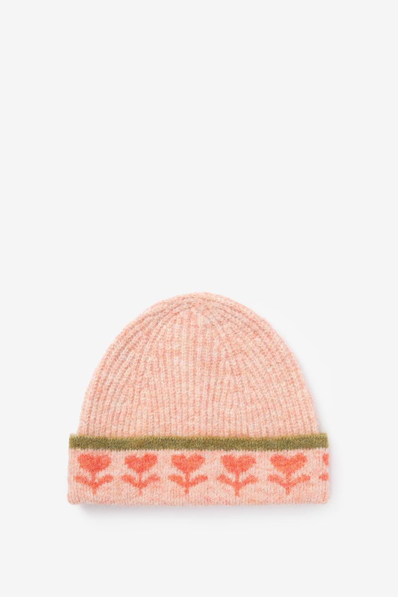 De gebreide muts heeft een lichtroze kleur met hartjes en een groene streep. Lichtroze muts met hartjes van Sissy-Boy.