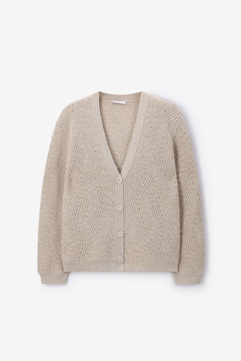 Verder heeft het vest een gebreid visgraat patroon met daarin goudkleurige lurex glitter details. Het vest heeft lange mouwen, ribboorden, een knoopsluiting, een V-halslijn, verlaagde schouders en een relaxed fit.