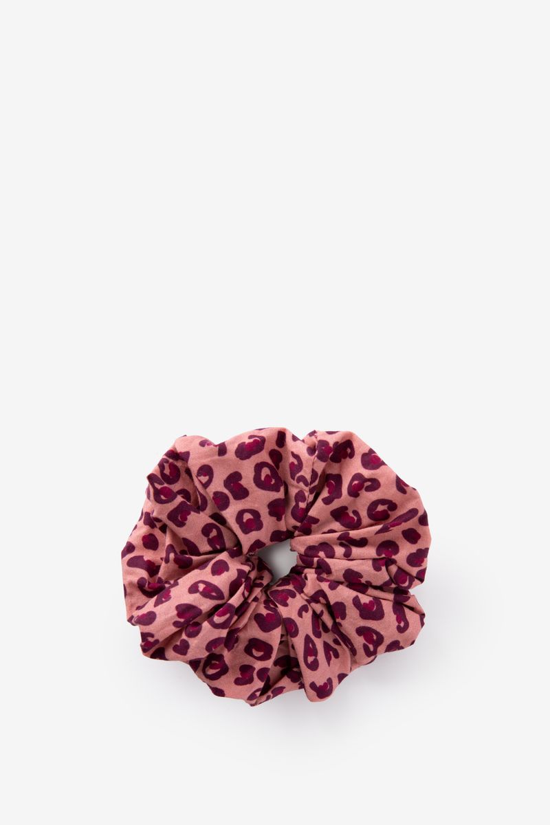 De haarelastiek heeft een roze kleur met een all-over paarse leopard print. Roze scrunchie van Sissy-Boy.