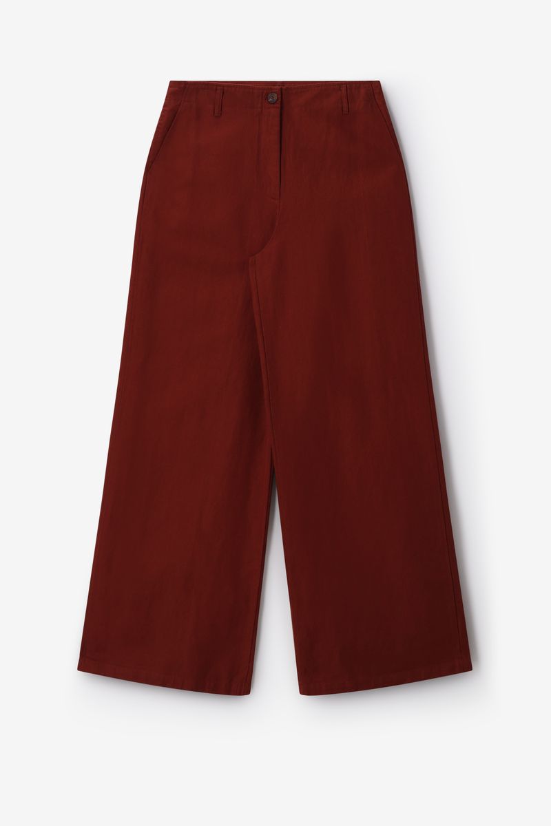 Verder heeft de broek een donkerrode kleur metéén steekzak aan de voorzijde. De broek heeft wijd uitlopende broekspijpen, een hoge taille, riemlussen en een knoop- en ritssluiting.