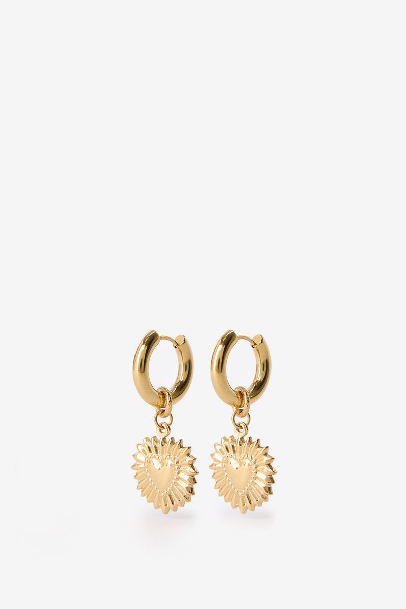De oorbellen hebben een gouden kleur, kleine hoops en een hartjes bedel. Gold plated oorbellen met hartjes.