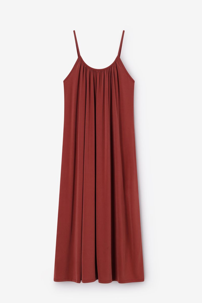 De jurk heeft spaghettibandjes, een ronde halslijn, geplooide details, maxi lengte en een rechte model. Donkerrode jersey jurk van Sissy-Boy.
