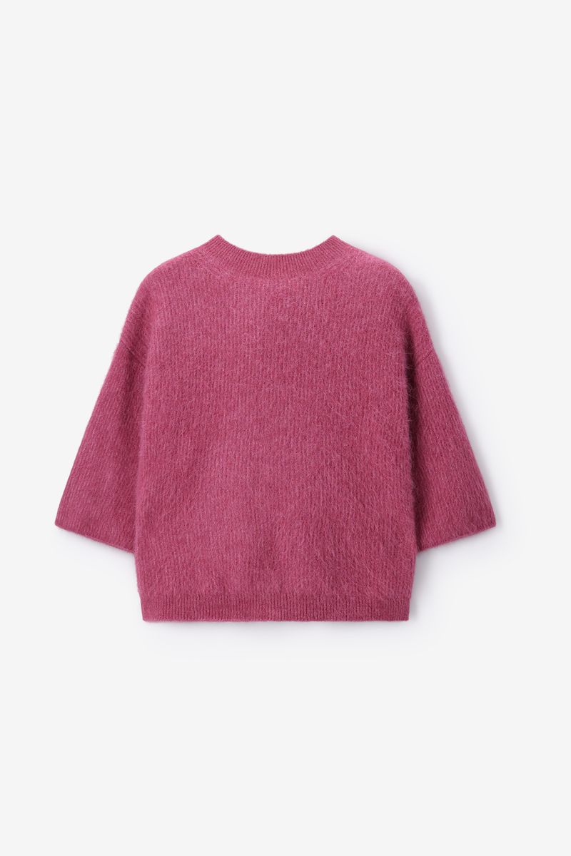 Verder heeft de trui op de achterzijde een split met een grote strik. De trui heeft wijd uitlopende driekwart mouwen, een ronde halslijn, verlaagde schouders en een relaxed fit.