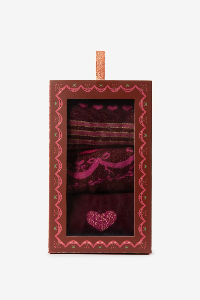 De sokken hebben een donkerrode kleur met een all-over hartjes, strikjes en streepjes print. Donkerrode sokken set van 3 van Sissy-Boy.