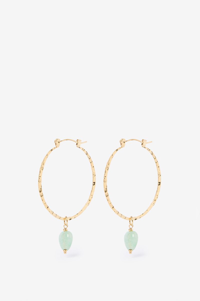 Daarnaast hebben de hoop oorbellen een groene hartvormige steen als hanger. De oorringen hebben een gouden kleur met een lichte structuur. Gouden oorringen met steen van Sissy-Boy.