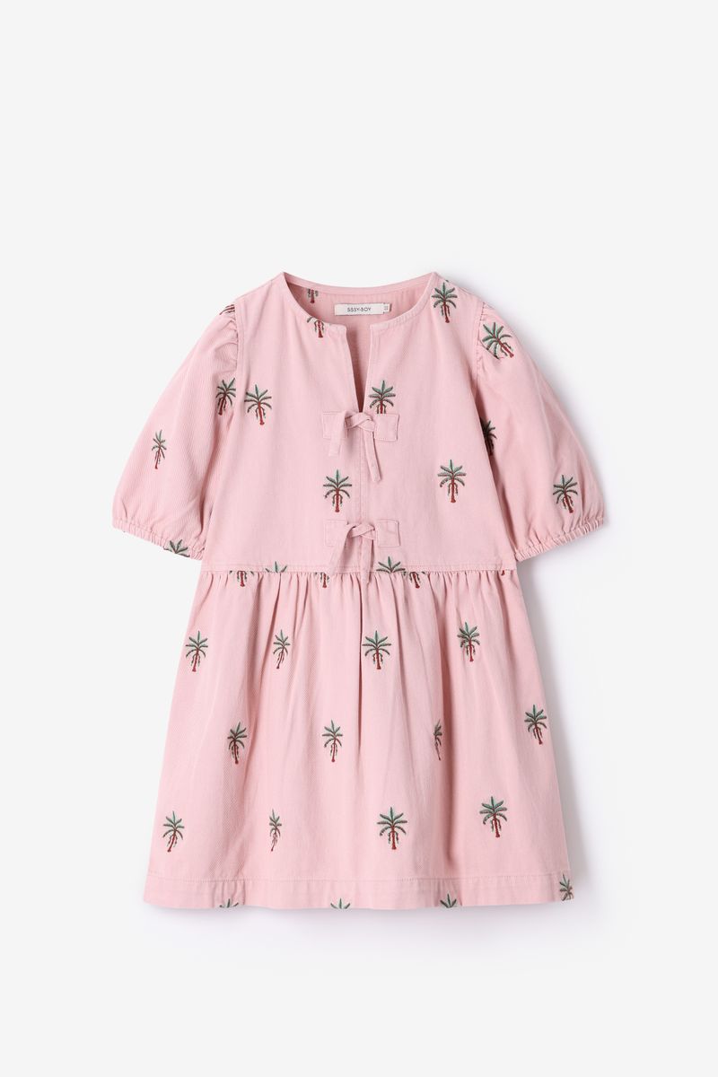 Verder heeft de jurk een lichtroze kleur met all-over palmbomen embroidery. De jurk heeft korte pofmouwen, een ronde halslijn en een striksluiting.