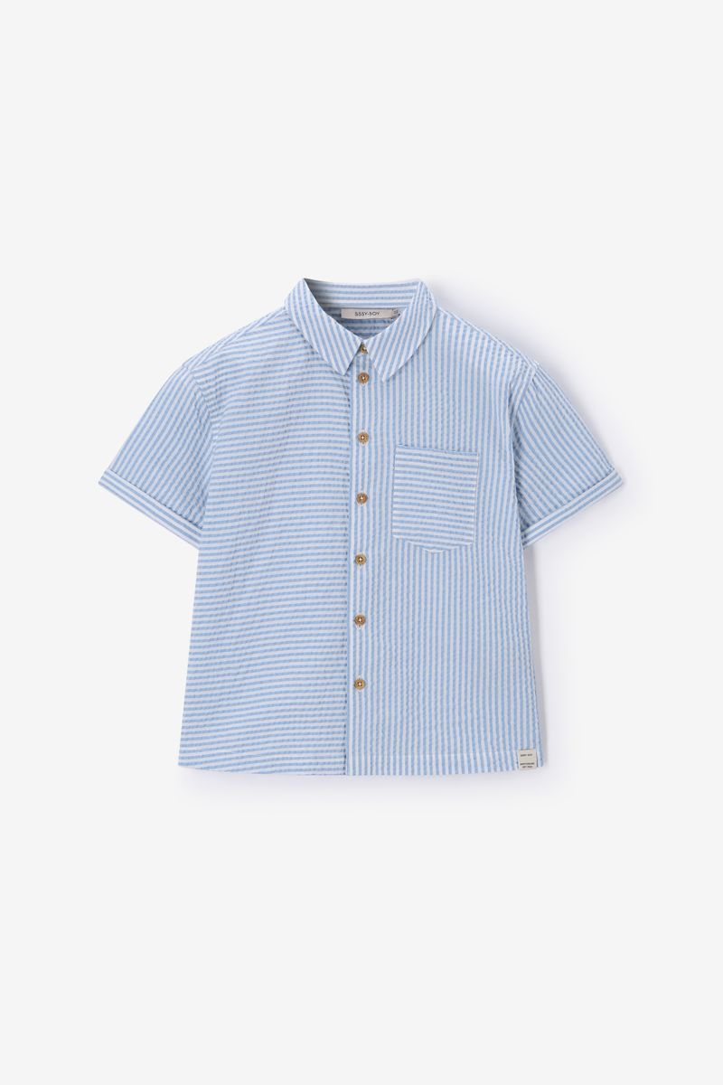 Verder heeft het overhemd een blauwe kleur met een all-over witte strepen design en een katoenen seersucker kwaliteit. Het overhemd heeft korte mouwen, een polokraag, knoopsluiting aan de voorzijde,één opgestikte borstzak en een relaxed fit.