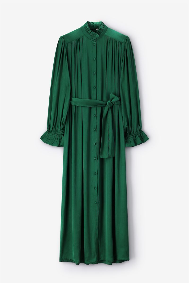 De jurk heeft lange pofmouwen, een hoge hals, een knoopsluiting en ruffle details rond de hals en mouwen. Groene satijnen maxi jurk van Sissy-Boy.